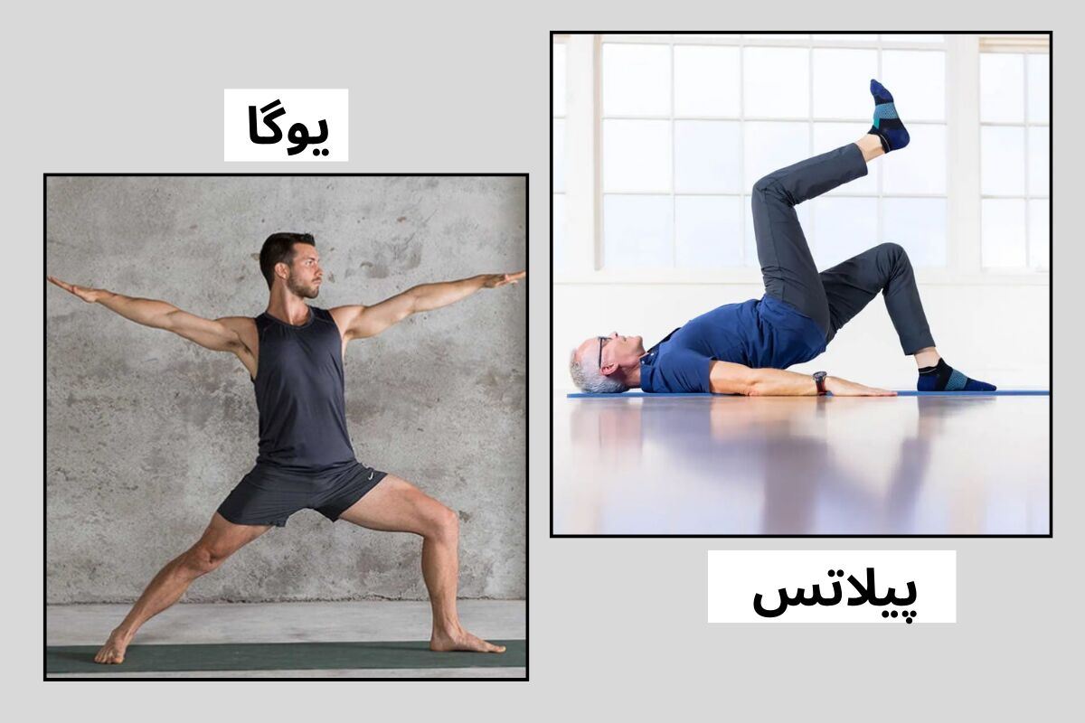 یک ورزش کار در حال یوگا و یک ورزش کار در حال انجام ورزش پیلاتس