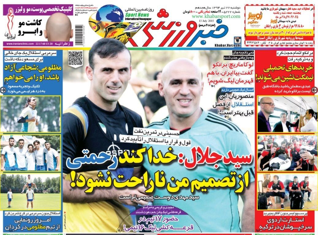 بازخوانی صفحه اول خبرورزشی؛ عکس جلد روزنامه خبر ورزشی در تاریخ ۲۲ تیر سال ۱۳۹۴ را ملاحظه میکنید.