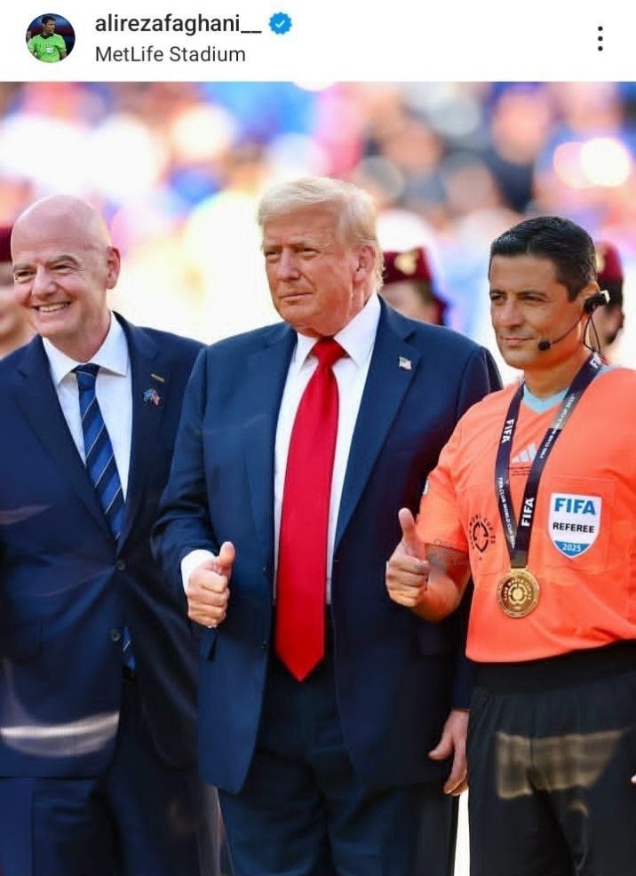 دقیقا یک ماه بعد در جریان رقابت‌هایی تحت عنوان جام جهانی باشگاه‌ها، علیرضا فغانی داور ایرانی با ملیت استرالیا بازی فینال را سوت زد. همان رئیس‌جمهور آمریکا پایان بازی هدایا را اهدا کرد. فغانی ایرانی با ژست فرمانده ارتش متجاوز به ایران عکس یادگاری گرفت و در صفحه شخصی‌اش ثبت کرد. کار خوبی کرد، چون هم خودش و هم ما نباید فراموش کنیم چه اشتباه بزرگی کرد. فغانی در داوری فوتبال درجه یک است، اما در قضاوت وجدان تاریخی و تفاوت گذاشتن میان متجاوز خارجی و اختلاف با حاکمان داخلی آماتور است.