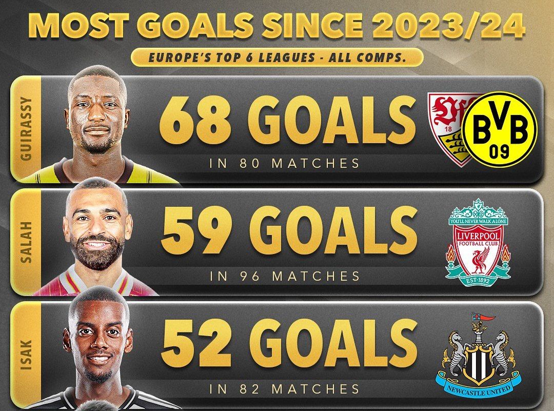 با توجه به انتقال قریبالوقوع ویکتور گیوکرش به آرسنال، مرجع آماری ترنسفرمارکت از ۱۰ بازیکن با بیشترین گل زده در شش لیگ برتر اروپا (انگلیس، اسپانیا، ایتالیا، آلمان، فرانسه و پرتغال) از آغاز فصل ۲۴-۲۰۲۳ رونمایی کرده است؛ درست زمانی که دوران ویکتور گیوکرش در اسپورتینگ لیسبون شروع شد.