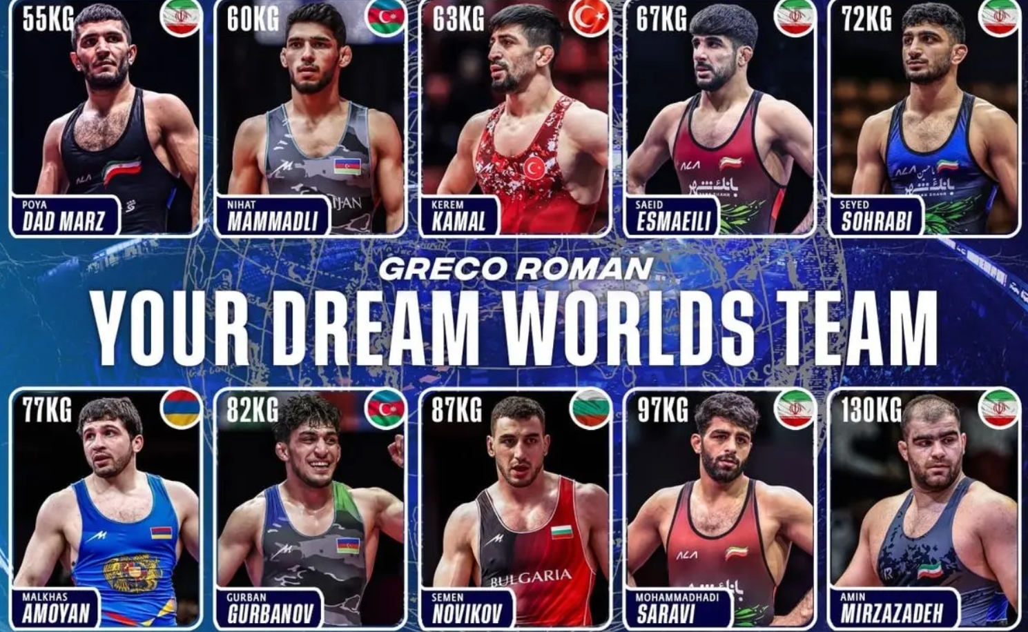 در این ترکیب رؤیایی، نامهای آشنای کشتی فرنگی ایران چون پویا دادمرز (۵۵ کیلوگرم)، سعید اسماعیلی (۶۷ کیلوگرم)، سید سجاد سهرابی (۷۲ کیلوگرم)، محمدهادی ساروی (۹۷ کیلوگرم) و امین میرزازاده (۱۳۰ کیلوگرم) دیده میشود. این کشتیگیران در کنار ستارههایی از کشورهایی چون ترکیه، آذربایجان، ارمنستان و بلغارستان، تیم رؤیایی جهانی را شکل دادهاند.