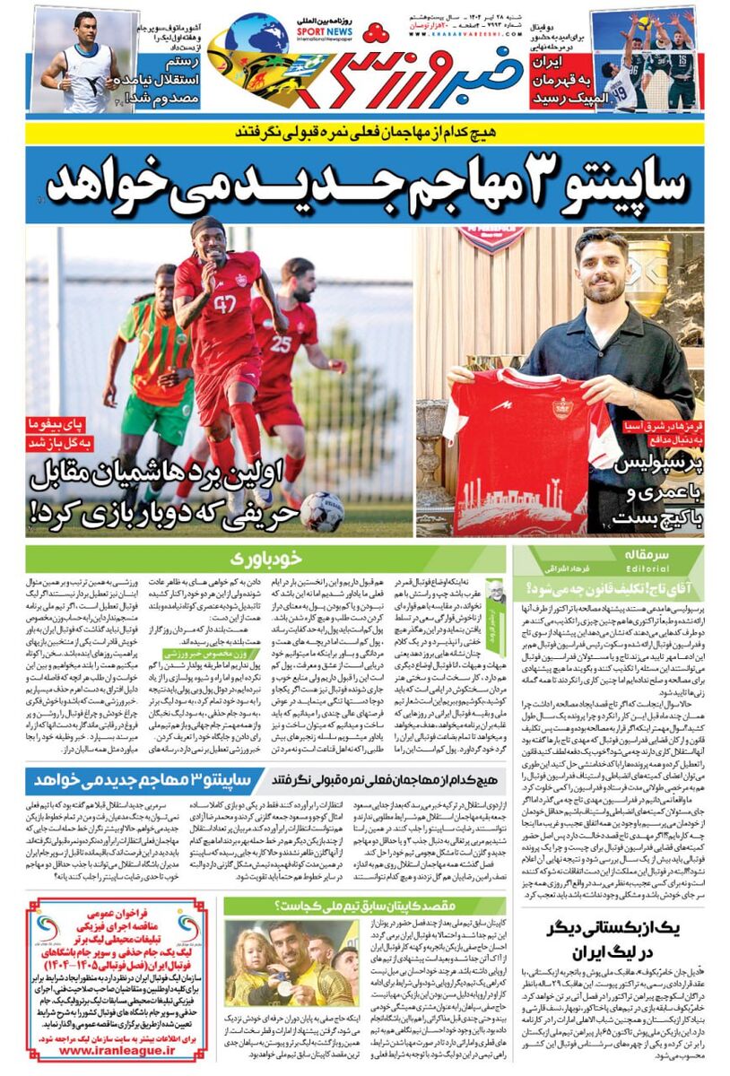 تیتر یک خبرورزشی فردا به استقلال و ساپینتو اختصاص دارد. روزنامه خبرورزشی از اردوی ترکیه گزارش کرده ساپینتو هیچ یک از مهاجمان فعلی تیم را نپسندیده و خواهان جذب سه مهاجم جدید شده است.