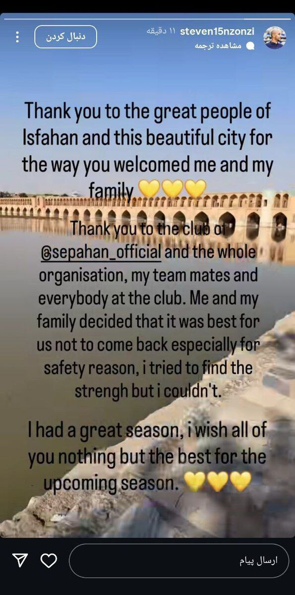به گزارش خبرورزشی، استیون انزونزی هافبک فرانسوی تیم سپاهان با انتشار یک استوری، رسما جدایی خود را از جمع طلایی پوشان اعلام کرد.