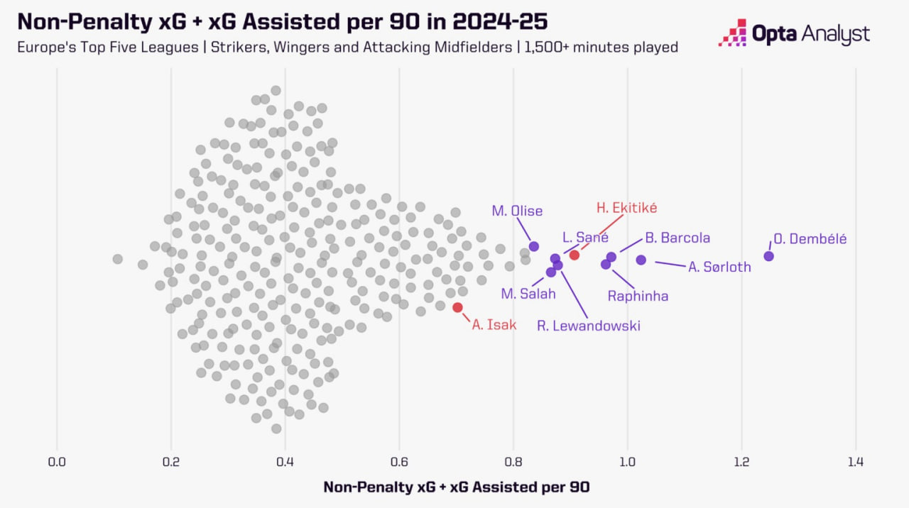 با کاوش در اعداد و ارقام کمتر مورد توجه، میبینیم که خروجی تهاجمی او در زمینههای xG غیر پنالتی و xA در سطح نخبگان است. با نگاه کردن به فهرست بازیکنان پنج لیگ معتبر اروپایی که حداقل ۱۵۰۰ دقیقه در فصل ۲۵-۲۰۲۴ بازی کردهاند، میبینیم که اکیتیکه در رده پنجم ثبت بیشترین میزان xG غیر پنالتی در هر ۹۰ دقیقه است (۰.۶۷) و در جمع ۵۰ بازیکن برتر در زمینهی xA در هر ۹۰ دقیقه قرار دارد (۰.۲۴). در هر دو شاخصه، او عملکرد بهتری از الکساندر ایساک داشته است!
