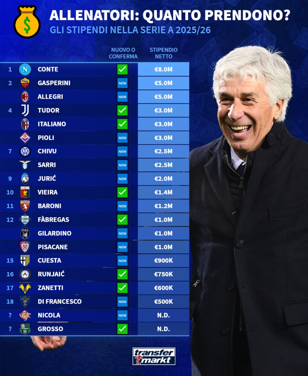 آنتونیو کونته که پس از فتح اسکودتو، دومین فصل همکاری خود با ناپولی را آغاز می‌کند، به طور خالص ۸ میلیون یورو در سال از این باشگاه دریافت می‌کند. جانپیرو گاسپرینی پس از نشستن روی نیمکت رم و مکس الگری پس از بازگشت به میلان، سالیانه ۵ میلیون یورو دستمزد دریافت می‌کنند و در رتبه دوم قرار می‌گیرند.