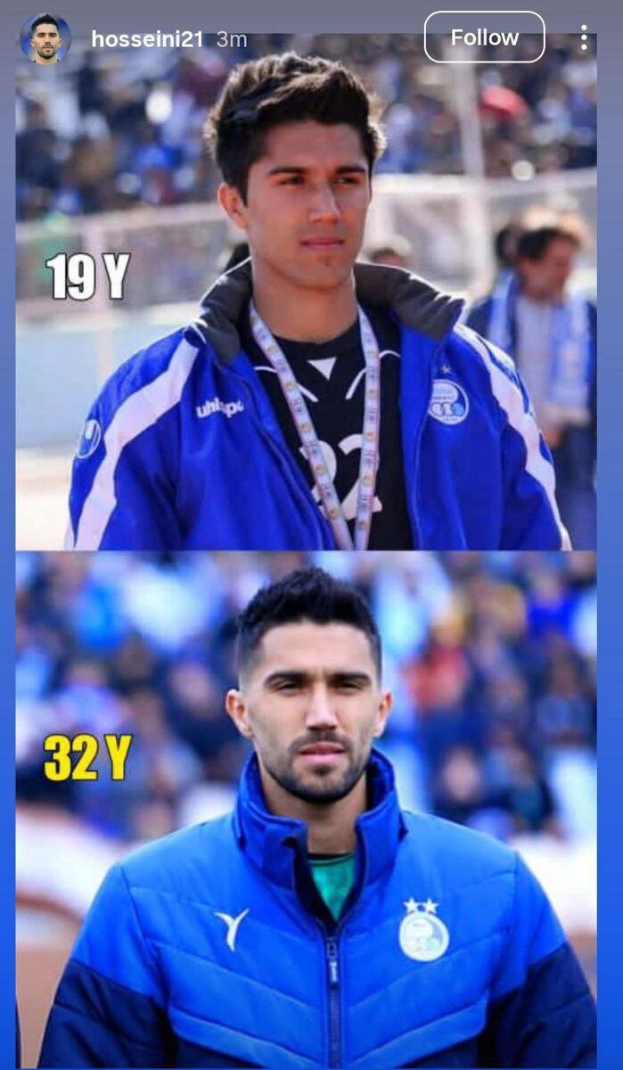 کاپیتان استقلال با انتشار دو تصویر از خود با پیراهن آبی — یکی مربوط به ۱۷ سالگی و دیگری در ۳۲ سالگی — تلویحاً به وفاداریاش به باشگاه استقلال اشاره کرده است. این استوری احساسی، در زمانی منتشر شد که هواداران به شدت نگران جدایی احتمالی او هستند و این حرکت حسینی نوعی اعلام وفاداری غیرمستقیم از سوی او تلقی شده است.