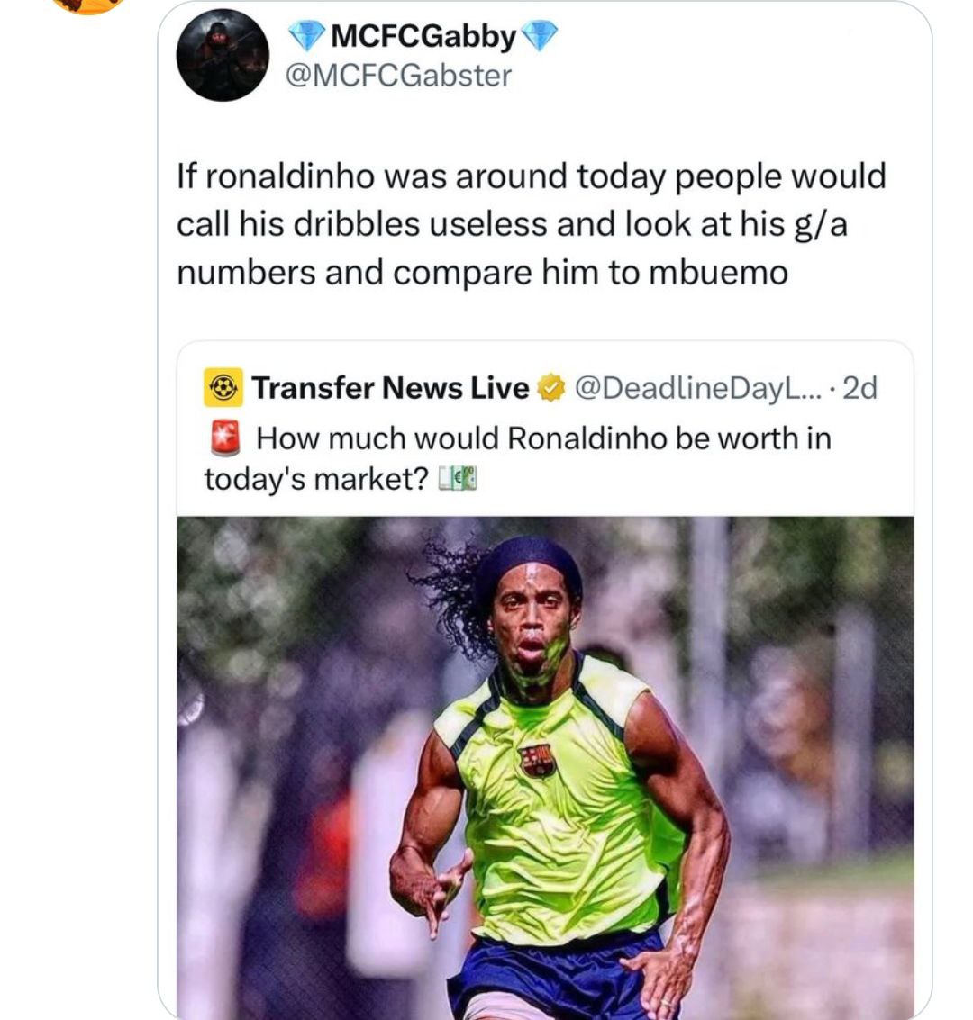 پاسخ یک هوادار: اگر رونالدینیو این روزها بازی میکرد، مردم میگفتند دریبلهایش بی ثمر است و به تعداد گل/پاس گلهایش نگاه میکردند و با امبومو مقایسه میشد