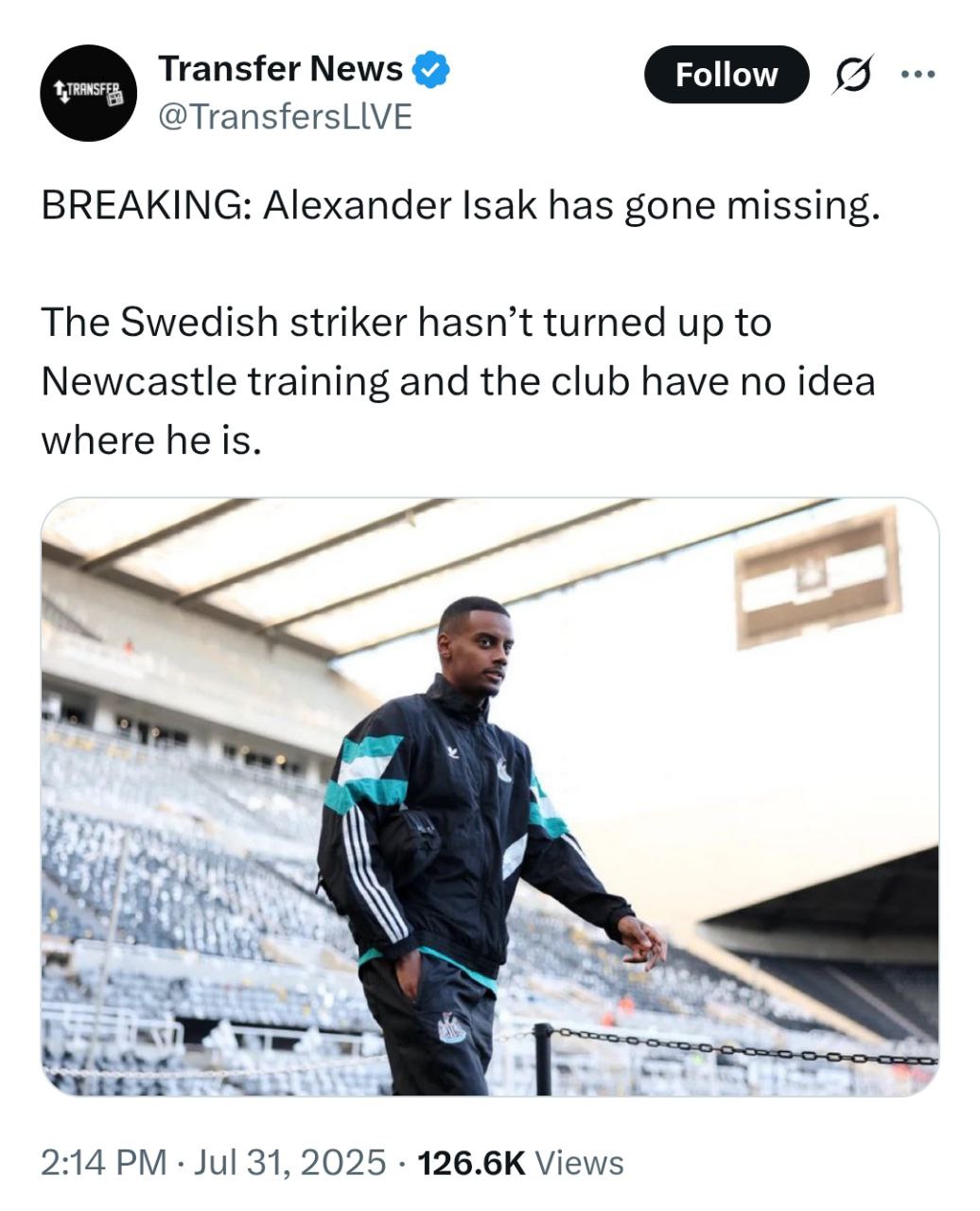 مهاجم سوئدی در تمرینات نیوکاسل حاضر نشده و باشگاه اصلا نمیداند او کجاست