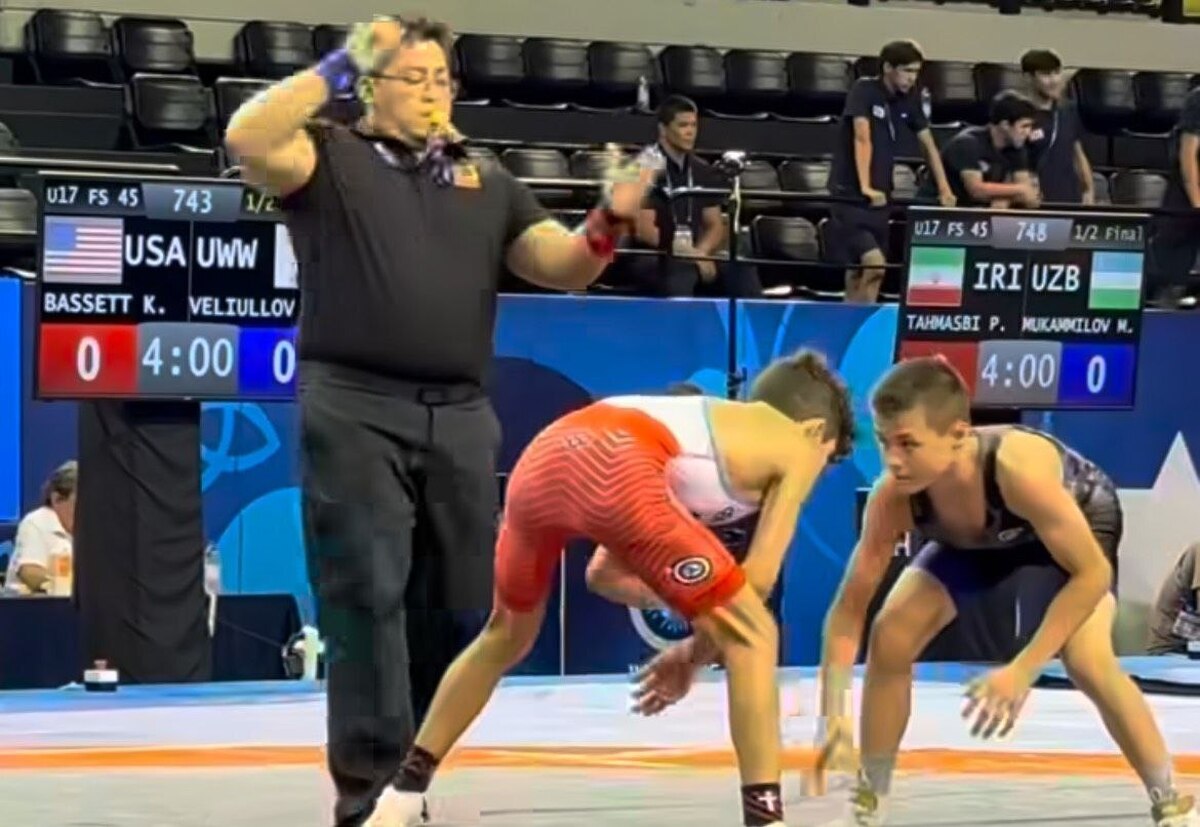 پیش از آن، آریا میلز در وزن ۴۸ کیلوگرم پر قدرت ظاهر شد و سینا بوستانی از ایران را با نتیجه ۱۲ بر ۱ مغلوب کرد. میلز که در وقت نخست امتیاز فعالیت را واگذار کرد، با ضدحملات برقآسا، امتیازات متوالی کسب کرد تا با اختلاف فاحش به پیروزی برسد و اولین طلای تیم آمریکا در این رقابتها را کسب کند.