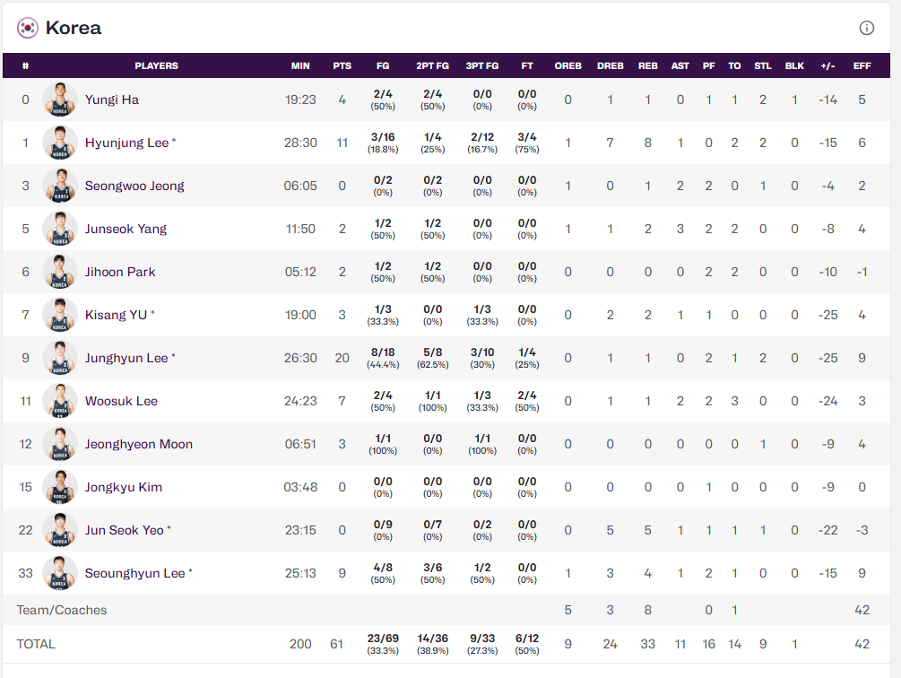 جک مکوی با ثبت ۲۰ امتیاز، در نقش رهبر تیمی درخشان ظاهر شد و عنوان بهترین بازیکن زمین (TCL Player of the Game) را از آن خود کرد. در سوی مقابل، جونگهیون لی با ۹ امتیاز بهترین بازیکن تیم کره بود، هرچند عملکرد تیمی ضعیف این تیم مانع از تأثیرگذاری او شد.