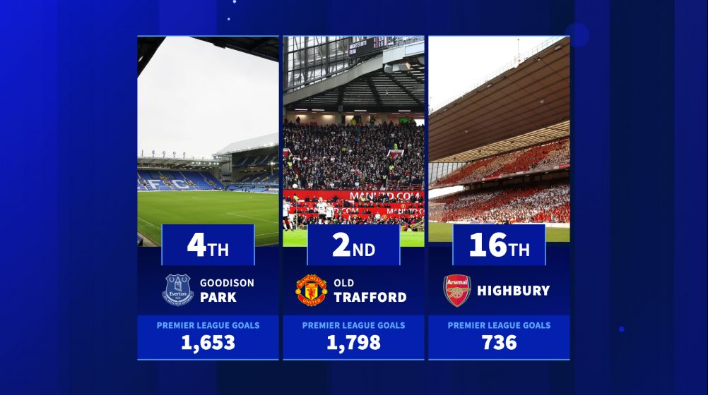 جالب اینکه آرسنال تنها باشگاهی است که دو ورزشگاهش در میان ۲۰ ورزشگاه برتر قرار دارند؛ زمین قدیمی این تیم، هایبوری، با ۷۳۶ گل در لیگ برتر، در جایگاه شانزدهم ایستاده است.