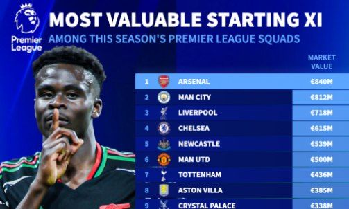جای تعجب نیست که تیم‌های مدعی قهرمانی در صدر این فهرست قرار دارند؛ با این حال، ترتیب آن‌ها با رده‌بندی تیم‌ها بر اساس ارزش کل ترکیب، اندکی متفاوت است. برای مثال، منچسترسیتی با ارزش بازار ۱.۳۵ میلیارد یورو، باارزش‌ترین ترکیب کلی را دارد، اما ترکیب اصلی پپ گواردیولا در این رتبه‌بندی، پس از آرسنال در جایگاه دوم قرار می‌گیرد.
