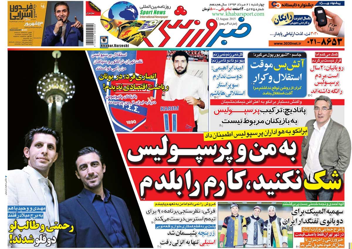 عکس جلد روزنامه خبرورزشی در تاریخ ۲۱ مرداد سال ۱۳۹۴ را ملاحظه میکنید.