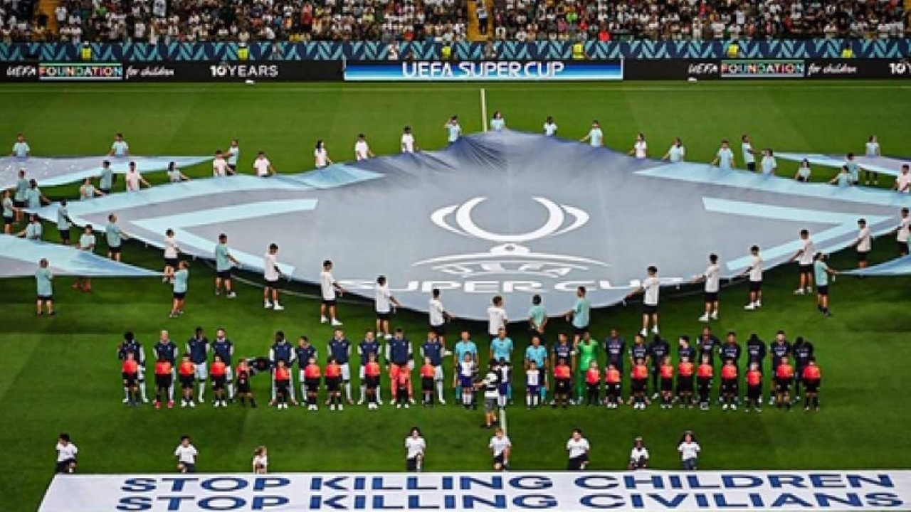 یوفا پیش از سوپرجام اروپا بنری با پیام «کشتار کودکان و غیرنظامیان را متوقف کنید» در اودینه ایتالیا به نمایش گذاشت.