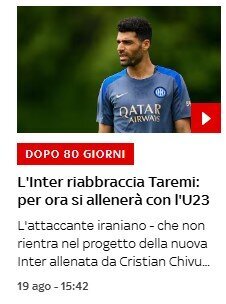 در چنین شرایطی اسکای اسپورت خبر داد که طارمی پس از یک دوری طولانی مدت از تمرینات اینتر به دلیل جنگ ۱۲ روزه سرانجام به ایتالیا بازگشت تا برخی تست‌های جسمانی را پشت سربگذارد.
