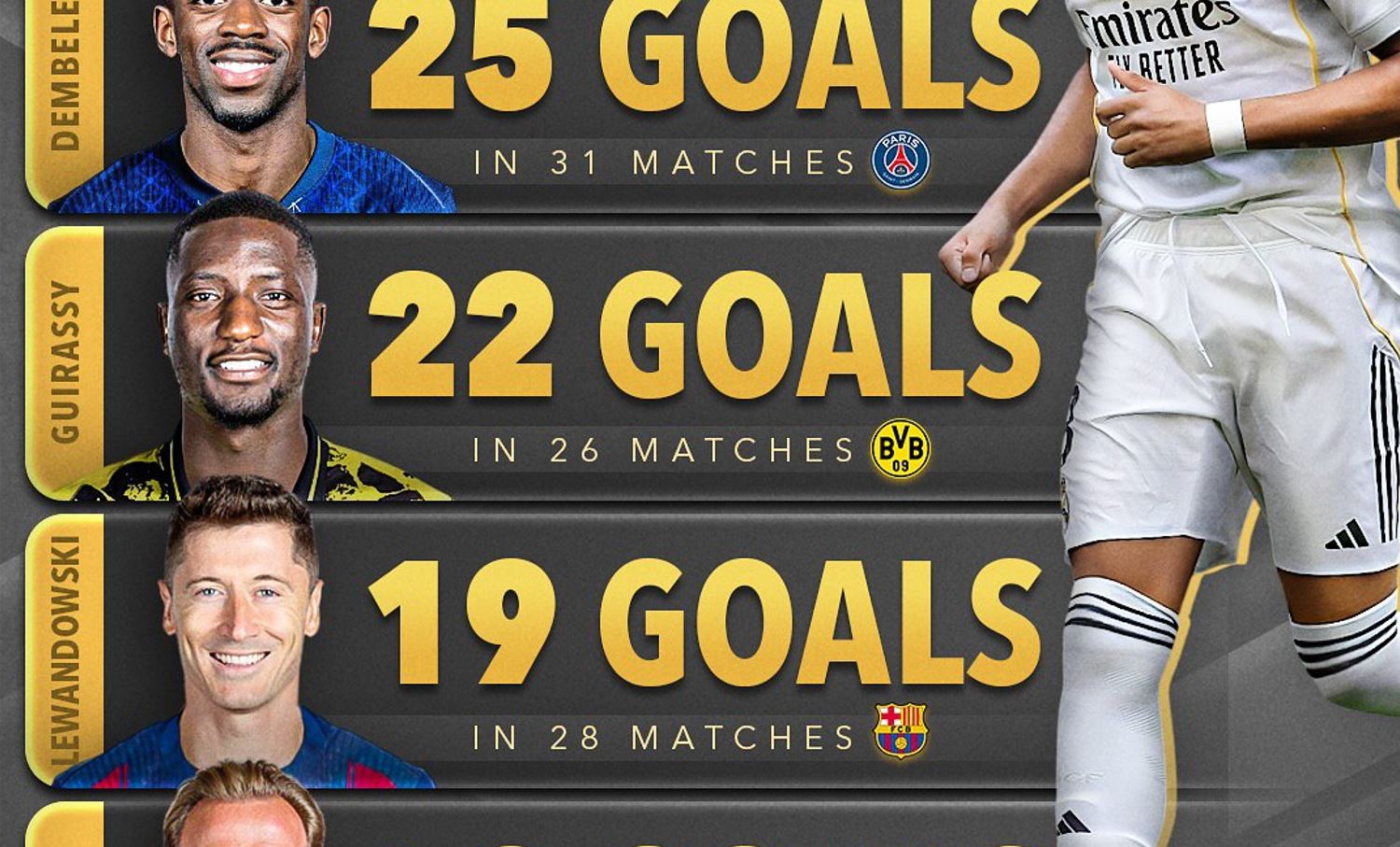 عثمان دمبله که به دلیل عملکرد درخشان و قهرمانی با پاری سن ژرمن در چهار جام، از جمله لیگ قهرمانان اروپا به عنوان یک مدعی کسب توپ طلا معرفی شده، در ۳۰ بازی ۲۵ گل زده و در جایگاه دوم جای گرفته است. پس از این دو فرانسوی، سرو گیراسی از دورتموند، روبرت لواندوفسکی از بارسلونا و هری کین از بایرن مونیخ در رتبههای سوم تا پنجم جای گرفتهاند.