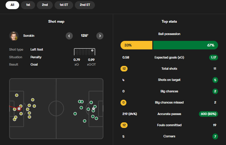 در ضربات پنالتی، تمیرلن اناربکوف، دروازهبان ۲۱ سالهی غیرت آلماتی عملکردی محشر و بینظیر داشت و با مهار سه پنالتی از پنج پنالتی بازیکنان سلتیک، موجبات پیروزی ۳-۲ تیمش و صعود به لیگ قهرمانان اروپا را فراهم کرد.