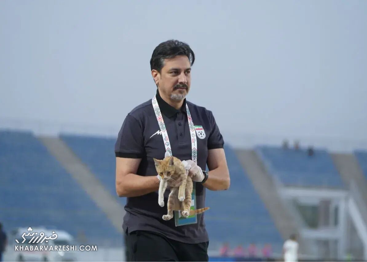 در اواسط نیمه، یک گربه زیبا و کنجکاو از کنار سکوها وارد محدوده نیمکت تیم ملی ایران شد. این مهمان کوچک و پشمالو برای دقایقی در کنار بازیکنان و کادر فنی آرام گرفت و با نگاههای بازیگوش خود اطراف را کاوش میکرد. اما حضورش هم میتوانست برای خودش خطرناک باشد و هم روند بازی را مختل کند. در این لحظه، دکتر علیرضا شهاب، پزشک تیم ملی ایران، با آرامش و خونسردی مثالزدنی وارد عمل شد. او با پوشیدن دستکش پزشکی، گربه را به آرامی بلند کرد و به مکانی امن در ورزشگاه منتقل نمود.