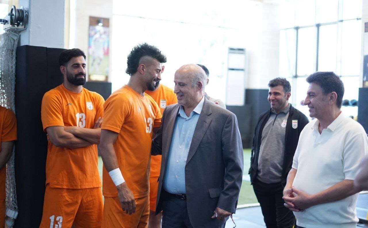 قبل از شروع تمرین امروز تیم ملی فوتبال ساحلی، مهدی تاج (رئیس فدراسیون)، هدایت ممبنی (دبیرکل)، فریده شجاعی (نایب رئیس سوم)، فرزین دبیری و محمد رحمان سالاری (عضو هیات رئیسه)، داود پرهیزکاری (رئیس مرکز ملی) و محمد آخوندی (سرپرست کمیته فوتبال ساحلی) در محل تمرین ساحلیبازان حضور یافته و ضمن بررسی شرایط اردویی ملیپوشان، با اعضای تیم ملی گفتوگو کردند. رئیس فدراسیون در این دیدار در خصوص انتخاب محمد آخوندی به عنوان سرپرست کمیته فوتبال ساحلی توضیح داد:
