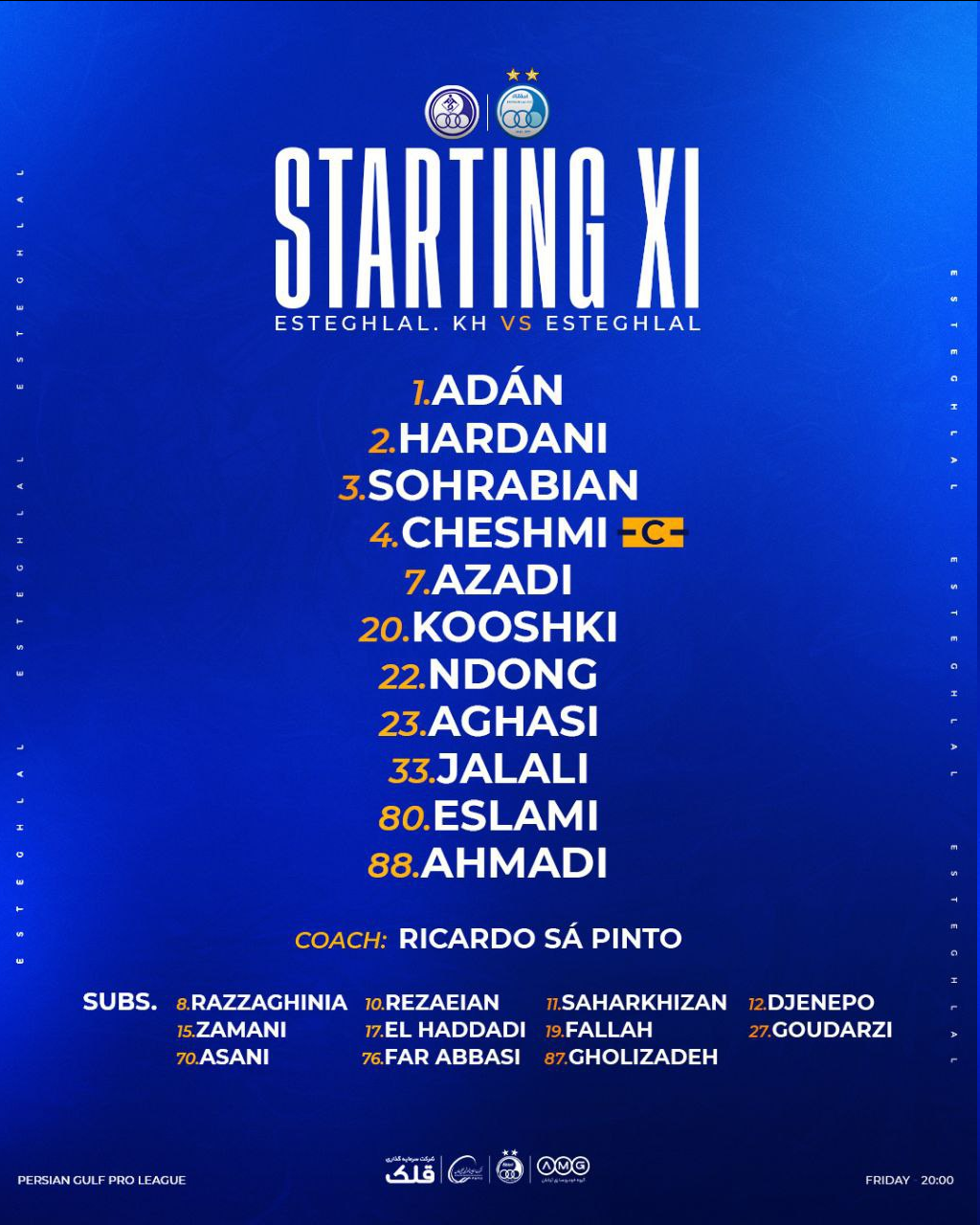ریکاردو ساپینتو سرمربی استقلال ترکیب تیمش را برای این بازی به شرح زیر انتخاب کرد: