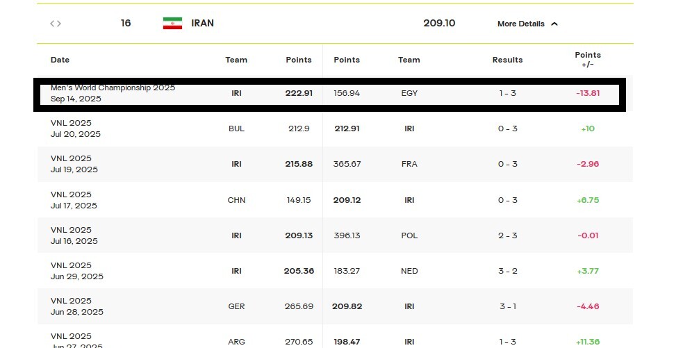 با شکست مقابل مصر تیم ملی والیبال ایران حدود ۱۴ امتیاز در رنکینگ جهانی از دست داد.