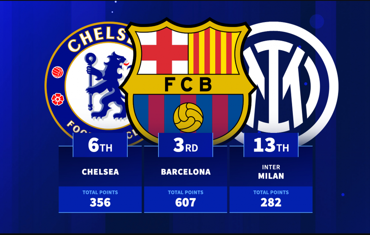 در صدر این جدول، رئال مادرید قرار دارد؛ تیمی با ۶۶۱ امتیاز از ۳۳۱ بازی که با اختلافی بیش از ۵۰ امتیاز نسبت به نزدیکترین تعقیبکننده، بهعنوان پادشاه بلامنازع اروپا شناخته میشود. پس از آن، بایرن مونیخ با ۶۰۹ امتیاز از ۳۰۸ بازی و بارسلونا با ۶۰۷ امتیاز از ۳۰۹ بازی به ترتیب در رتبههای دوم و سوم قرار دارند.