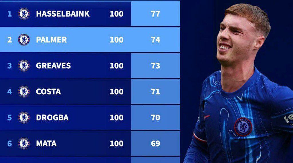 به گزارش ترنسفرمارکت، کول پالمر در بین تمام بازیکنان تاریخ چلسی پس از انجام ۱۰۰ بازی برای این باشگاه، در رتبهی دوم با بیشترین مشارکت گل بعد از این تعداد بازی قرار دارد. او حالا آمار ۷۴ گل و پاس گل را در پیراهن چلسی به ثبت رسانده و جیمی فلوید هاسلبنک تنها بازیکنی است که با ۷۷ مشارکت گل در ۱۰۰ بازی اولش برای چلسی، عملکرد بهتری از پالمر داشته است.