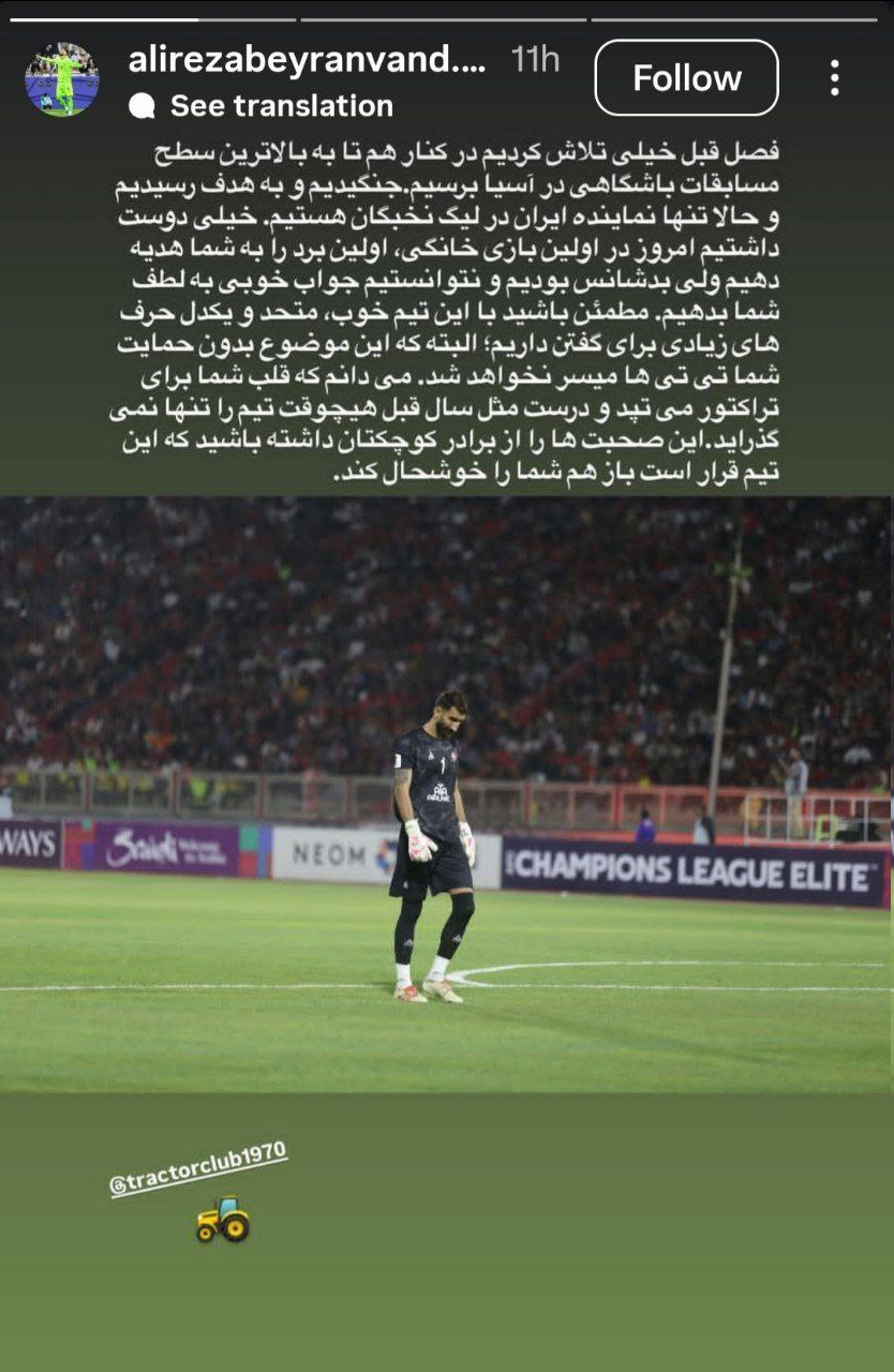 به گزارش خبرگزاری خبرآنلاین؛ علیرضا بیرانوند پس از تساوی تراکتور برابر الوحده امارات در لیگ نخبگان آسیا، پیامی صمیمانه برای هواداران تیمش منتشر کرد.