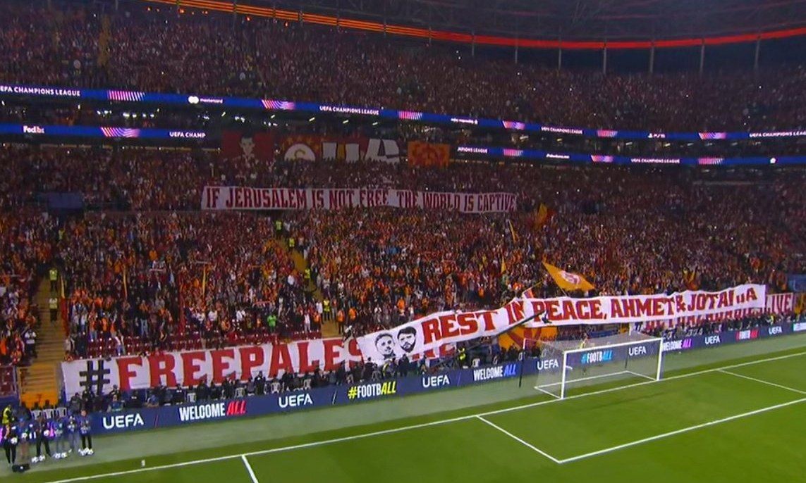 طرفداری | هواداران تیم فوتبال گالاتاسارای ترکیه در دیدار خانگی مقابل لیورپول در مرحله گروهی لیگ قهرمانان اروپا، با برافراشتن بنرهای اعتراضی، همبستگی خود را با مردم فلسطین نشان دادند.