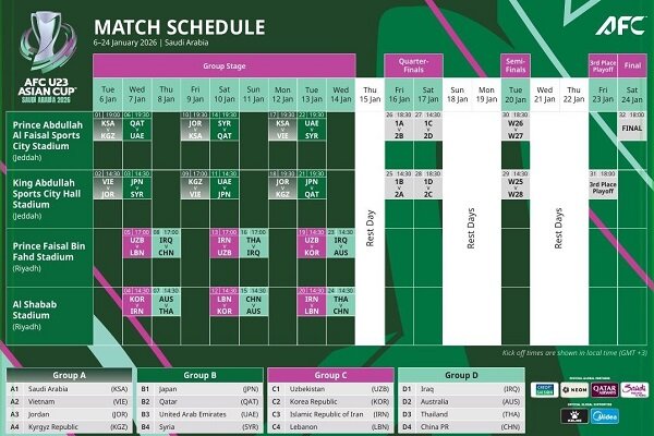 زمان و مکان برگزاری بازی های مرحله گروهی تیم فوتبال امید ایران در جام ملت های زیر ۲۳ سال آسیا مشخص شد.