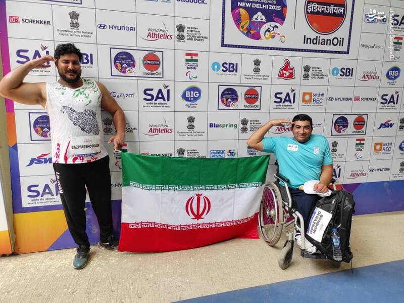علی بازیار و عرفان بندری پس از کسب مدال طلا و برنز پرتاب نیزه مسابقات پارادوومیدانی قهرمانی جهان با پرچم ایران سلام نظامی دادند.