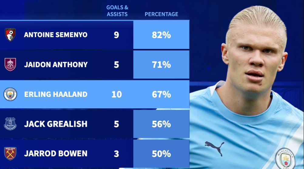هالند در هفت بازی ابتدایی لیگ این فصل، با ثبت ۹ گل و یک پاس گل، آماری خیرهکننده به جا گذاشته است. هرچند این عملکرد تحسینبرانگیز است، اما نشاندهنده این واقعیت نیز هست که ۶۷ درصد از کل گلهای منچسترسیتی در این رقابتها به او وابسته بوده است. همانطور که در نمودار بالا نشان داده شده، تنها دو تیم در این فصل به ستارههای خط حمله خود بیش از منچسترسیتی وابستهاند: برنلی با جیدون آنتونی (با نقش مستقیم در ۷۱ درصد از گلهای تیم) و بورنموث با آنتوان سمنیو (با نقش در ۸۲ درصد از گلهای تیم). با این حال، حتی تلاشهای هالند نیز نتوانسته منچسترسیتی را از شروع نسبتاً ضعیف این فصل نجات دهد.