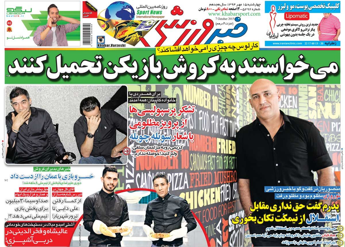 عکس جلد روزنامه خبرورزشی در تاریخ ۱۵ مهر سال ۱۳۹۴ را ملاحظه میکنید.