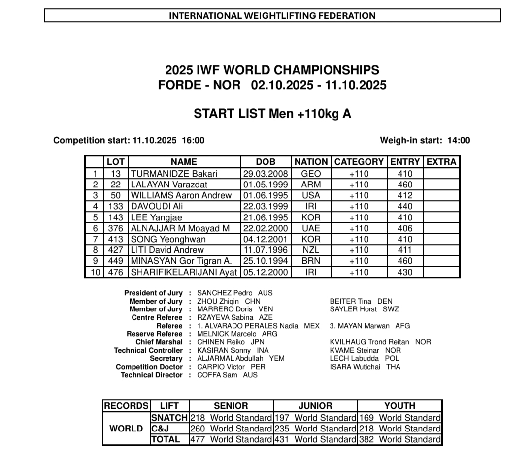 به گزارش خبرنگار ورزشی خبرگزاری دانشجو، رقابت‌های دسته فوق‌سنگین (+۱۱۰ کیلوگرم) وزنه‌برداری قهرمانی جهان عصر امروز در سالن اصلی شهر فورده نروژ برگزار خواهد شد. در این رقابت ۱۰ وزنه‌بردار مطرح از کشور‌های مختلف روی تخته می‌روند و ایران با دو نماینده یعنی علی داوودی و آیت شریفی حضور دارد. این مسابقات از ساعت ۱۷:۳۰ به وقت تهران آغاز شده و آخرین بخش رقابت‌های قهرمانی جهان ۲۰۲۵ محسوب می‌شود.