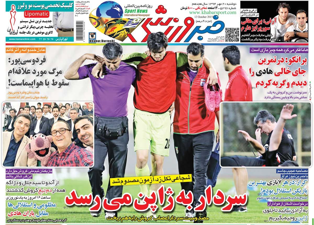 عکس جلد روزنامه خبرورزشی در تاریخ ۲۰ مهر سال ۱۳۹۴ را ملاحظه میکنید.