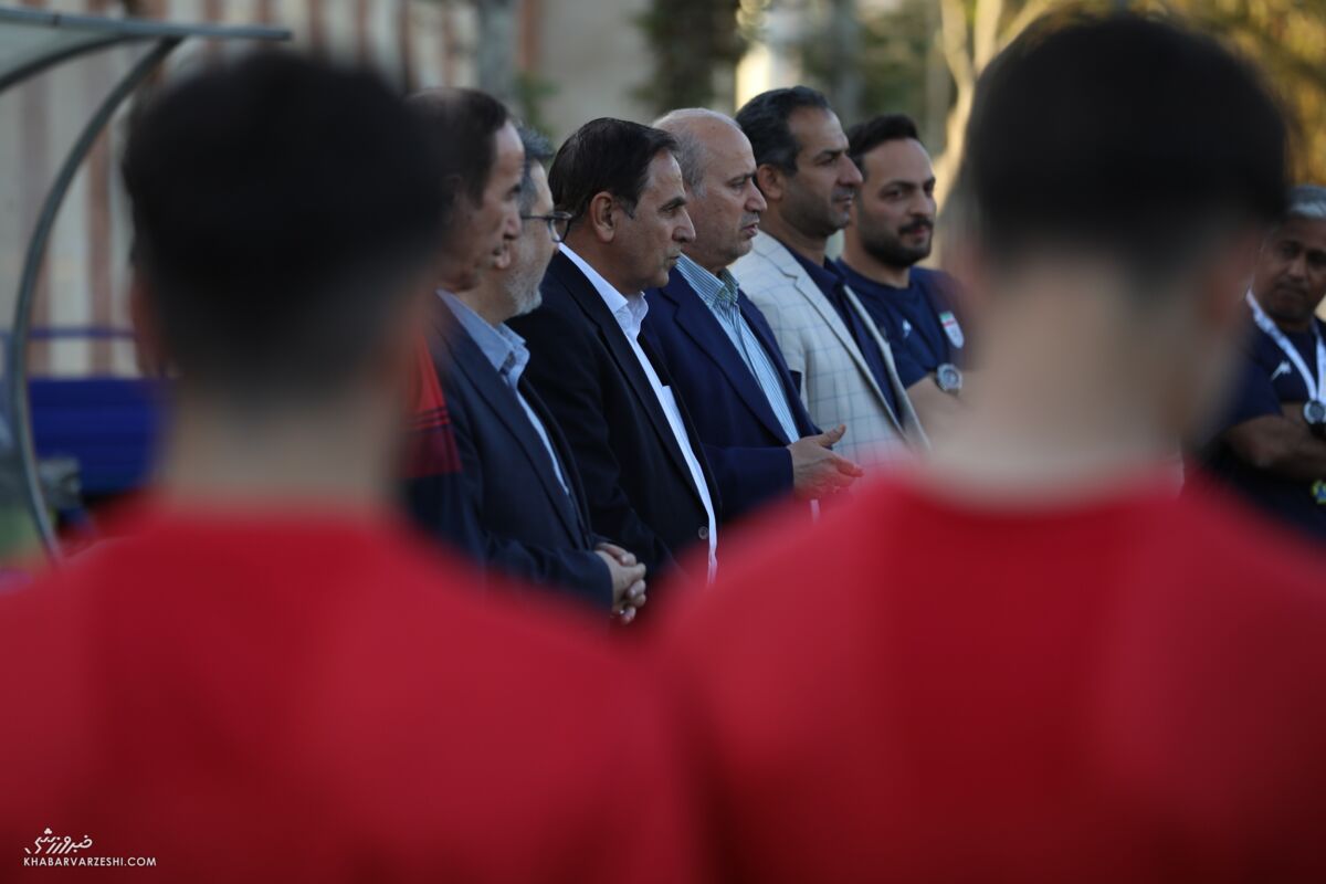 مهدی تاج، رئیس فدراسیون امروز(یکشنبه) همراه با نمایندگان مجلس شورای اسلامی، معاونت بانوان وزارت ورزش، اعضای هیات رئیسه فدراسیون، علی تارقلیزاده، مدیر فنی و توسعه و داود پرهیزکاری، رییس مرکز ملی فوتبال در محل تمرین تیم ملی نوجوانان حضور یافتند.