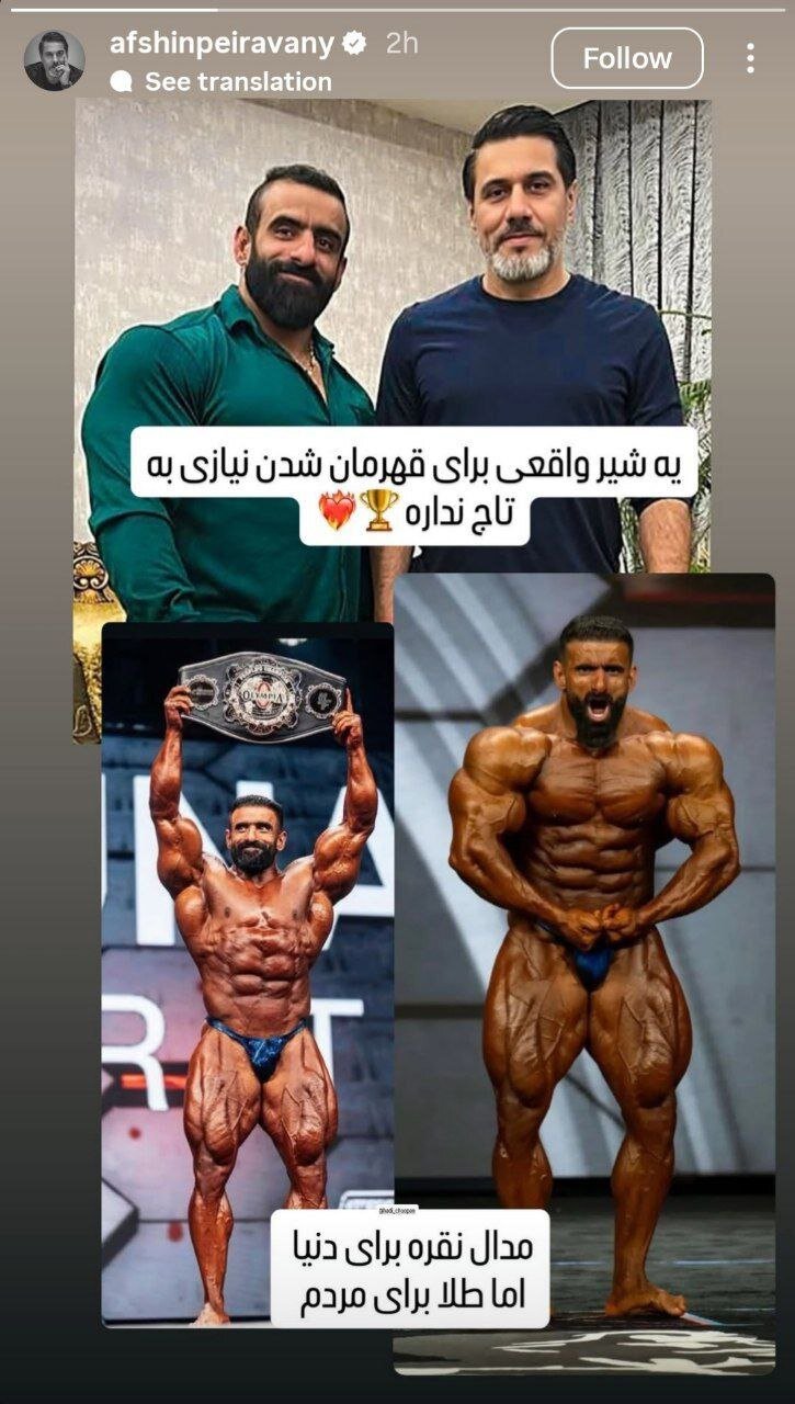افشین پیروانی با انتشار یک استوری از هادی چوپان بعد از نایب قهرمانی در مسابقات مسترالمپیا حمایت کرد و نوشت: شیر واقعی نیازی به تاج ندارد.