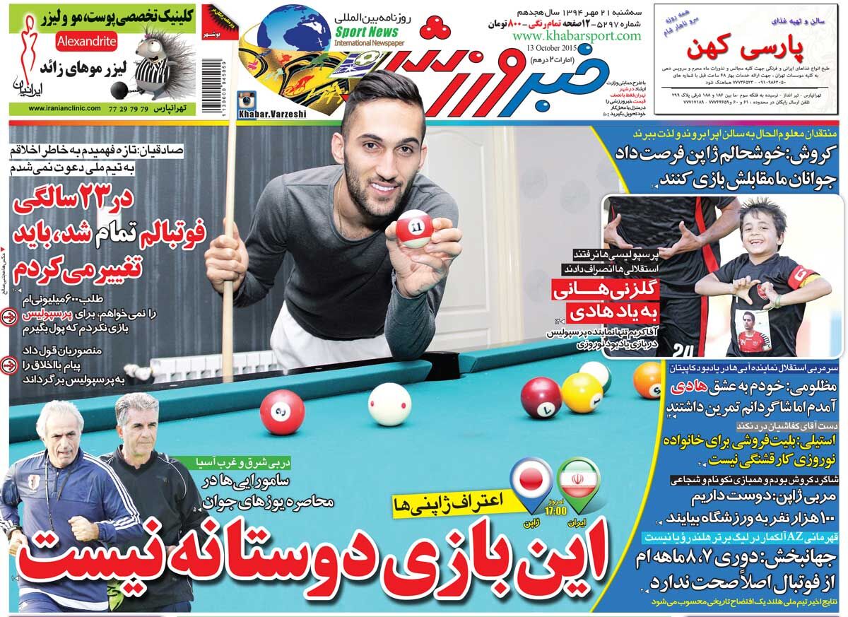 عکس جلد روزنامه خبرورزشی در تاریخ ۲۱ مهر سال ۱۳۹۴ را ملاحظه میکنید.