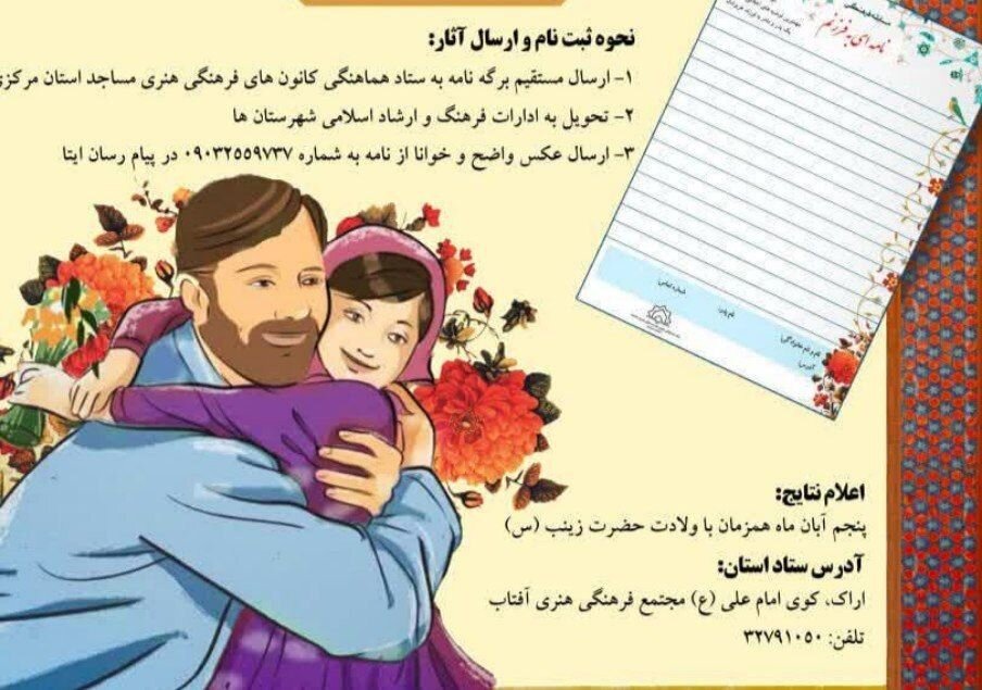 وی افزود: موضوع این مسابقه توصیههای اجتماعی و اخلاقی پدر و مادر به فرزندشان است و شرکتکنندگان باید نامهای دستنویس و خوانا خطاب به فرزند خود بنویسند.