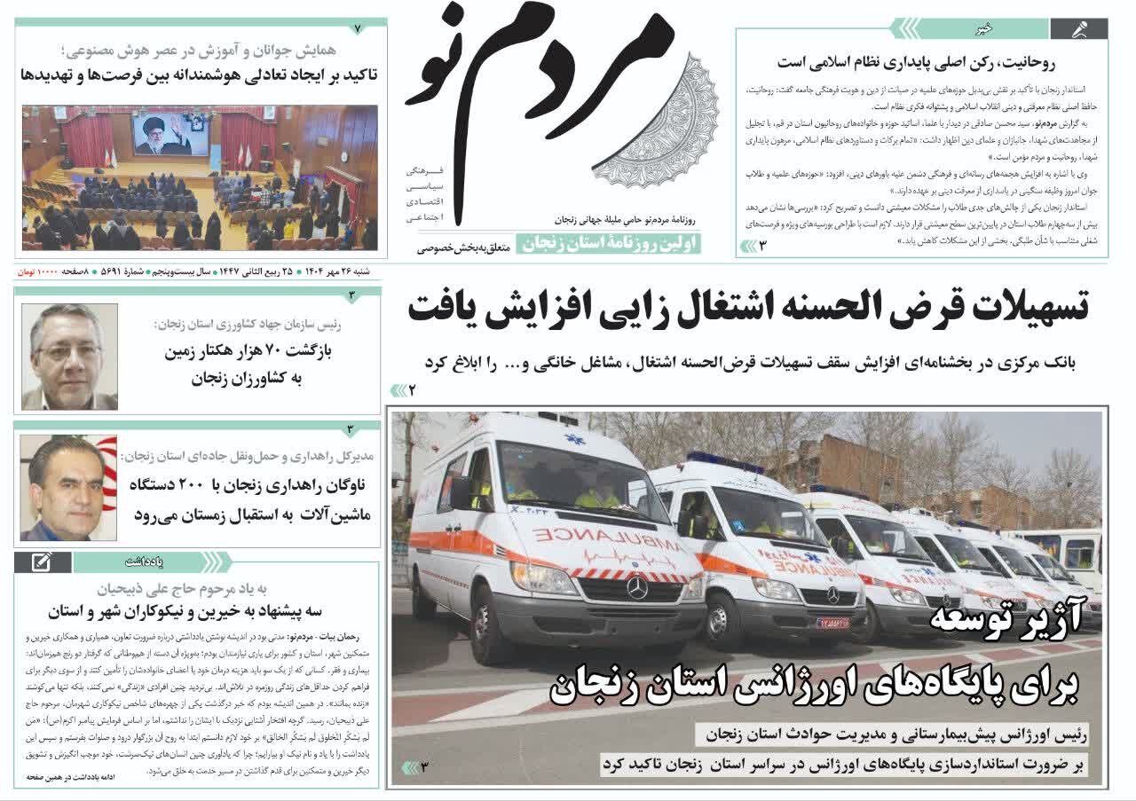 صفحه اول روزنامه های زنجان ۲۶ مهر ۱۴۰۴