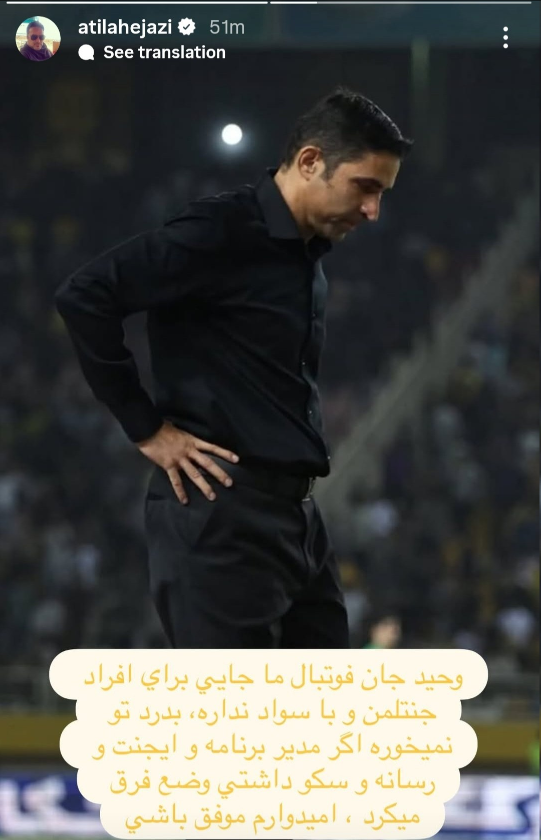 آتیلا حجازی با انتشار یک استوری به سرنوشت وحید هاشمیان در پرسپولیس واکنش نشان داد.