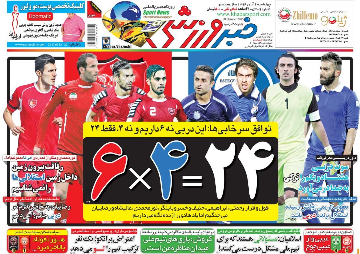 عکس جلد روزنامه خبرورزشی در تاریخ ۶ آبان ۱۳۹۴ را ملاحظه میکنید.