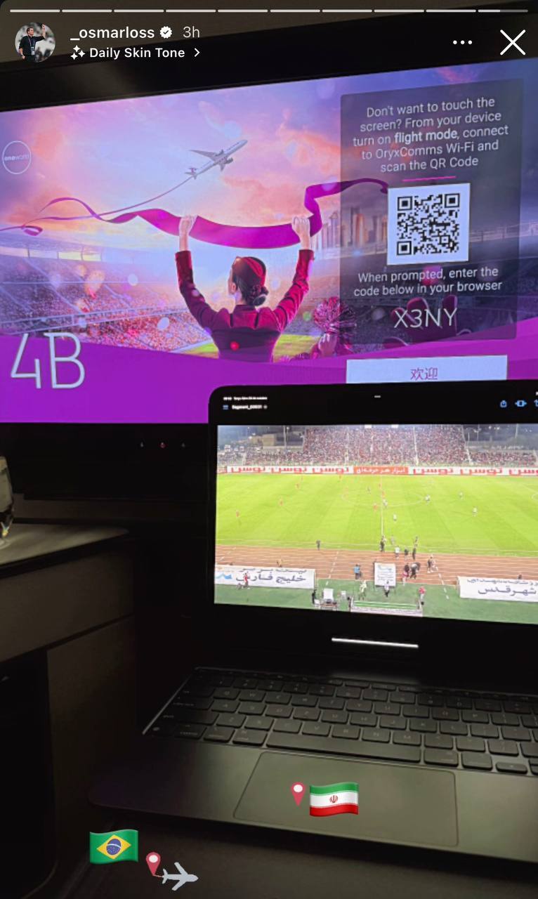 «اوسمار»؛ سرمربی جدید پرسپولیس استوری منتشر کرد که در پرواز برزیل – ایران در حال تماشای مسابقات این تیم است.