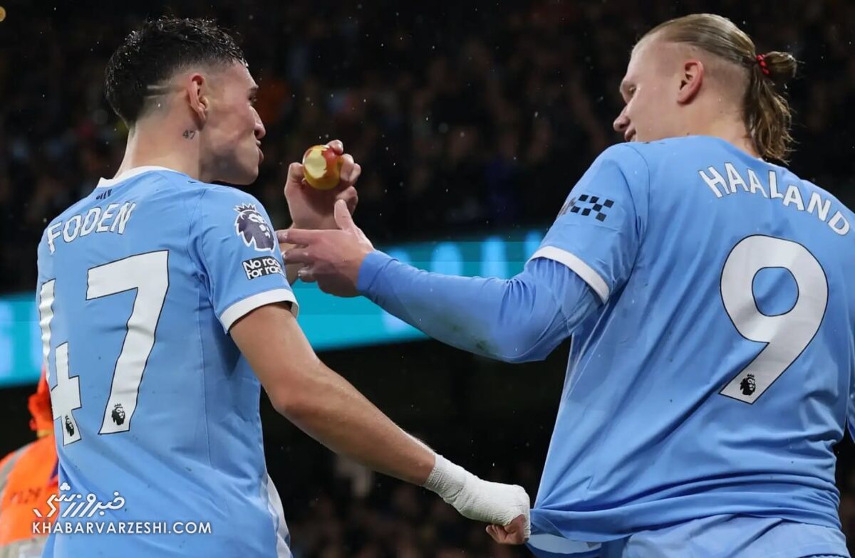 هالند و فودن بعد از گل منچسترسیتی به لیورپول سیبی که کنار زمین افتاده بود را گاز زدند.