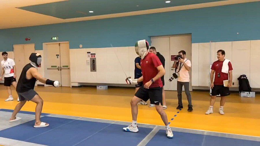 محمد هادی ساروی عضو تیم ملی کشتی فرنگی و علی پاکدامن عضو تیم ملی شمشیربازی ایران در حاشیه بازیهای کشورهای اسلامی مسابقه شمشیربازی برگزار کردند!