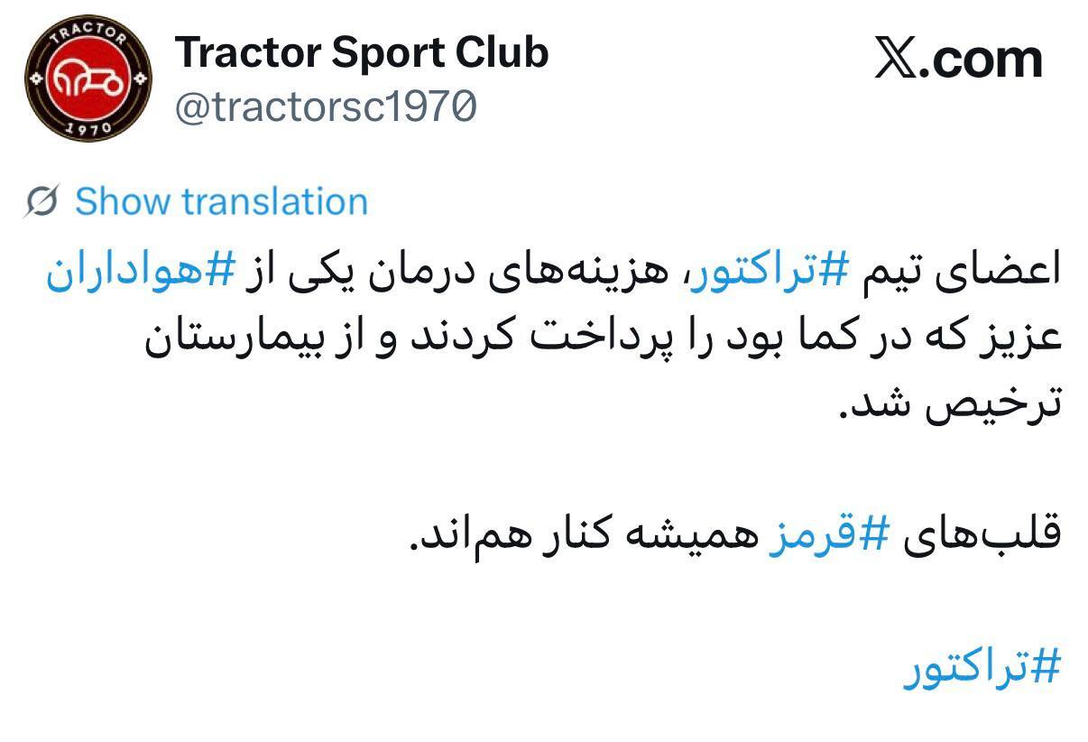 اعضای تیم تراکتور، هزینههای درمان یکی از هواداران عزیز را پرداخت کردند و از بیمارستان ترخیص شد.
