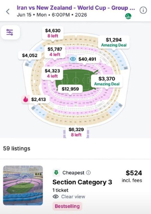 برای دیدار ایران – نیوزیلند که روز ۱۵ ژوئن ۲۰۲۶ برگزار میشود، پایینترین قیمت مربوط به بلیتهای Category 3 است که بین ۴۵۲ تا ۵۲۴ دلار (با احتساب هزینهها) عرضه میشود. این بلیتها بهصورت «رزرو ناحیه» فروخته میشوند و صندلی دقیق هنگام صدور نهایی مشخص خواهد شد. در سایر بخشهای ورزشگاه، قیمتها از سطح ۱۲۹۴ دلار آغاز شده و تا بیش از ۴۰ هزار دلار در بخشهای VIP افزایش مییابد. بخشهای نزدیک به زمین نیز در محدوده ۳۰۰۰ تا ۶۰۰۰ دلار قیمتگذاری شدهاند.