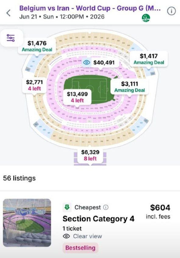 برای دیدار ایران – بلژیک که روز ۲۱ ژوئن برگزار خواهد شد، حداقل قیمت قابل خرید مربوط به Category 4 است که ۶۰۴ دلار اعلام شده است؛ رقمی که نسبت به بازی نخست افزایش چشمگیری دارد. سایر جایگاهها نیز از حدود ۱۴۰۰ دلار آغاز میشوند و در بعضی بخشها به ۱۳ هزار دلار و حتی ۴۰ هزار دلار میرسند. تقاضای قابلتوجه برای این مسابقه، بهویژه با توجه به نام حریف و زمان برگزاری، یکی از عوامل اصلی افزایش قیمت محسوب میشود.