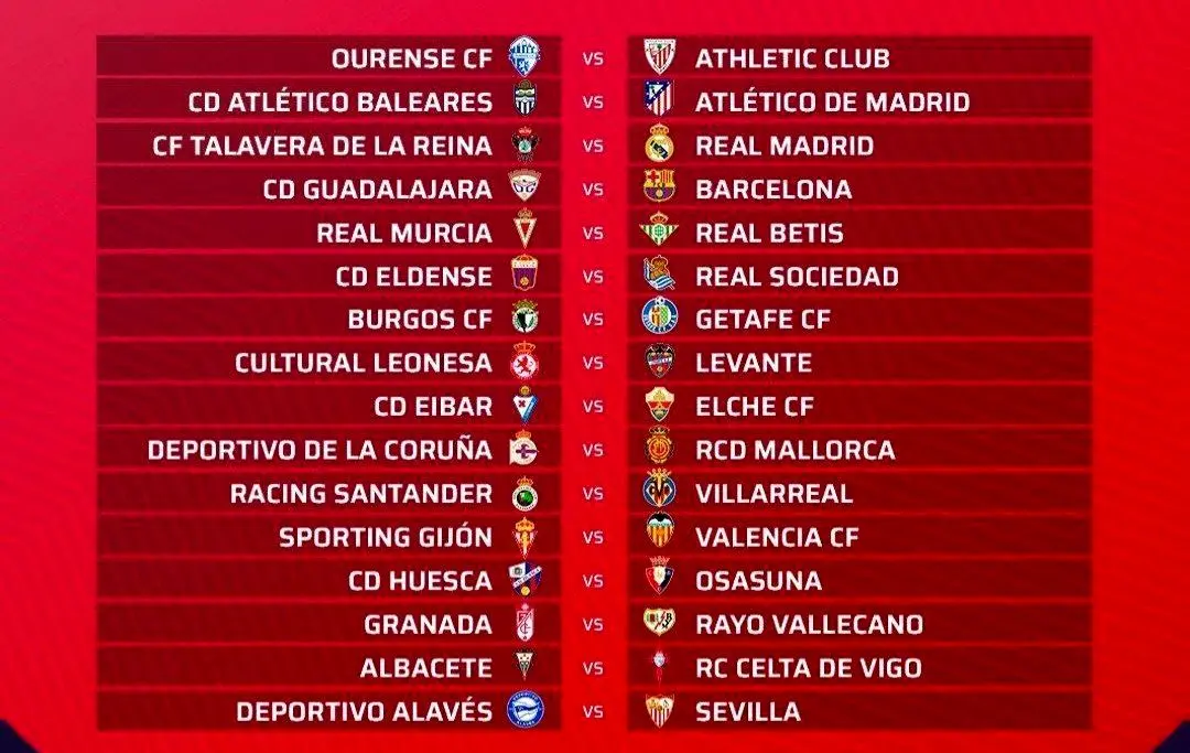 تیم اتلتیکو بالئارس، که پایینترین رتبه را در این قرعهکشی دارد، در ورزشگاه استادی بالئار از اتلتیکو مادرید پذیرایی خواهد کرد. همچنین، اوئرانسه سیاف که به عنوان نماینده کوپا فدراسیون در این مرحله حضور دارد، در ورزشگاه او کوتو با اتلتیک بیلبائو مواجه خواهد شد.