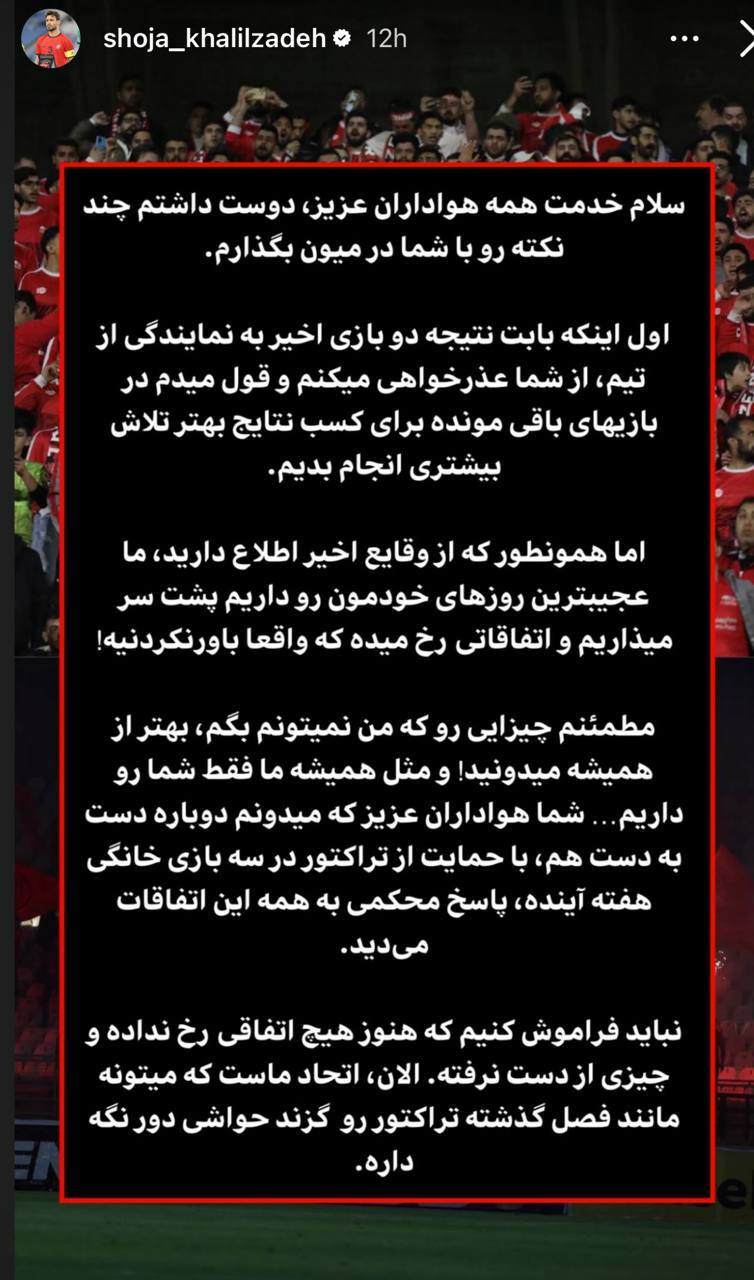کاپیتان پرسپولیس، با انتشار یک استوری اینستاگرامی، از هواداران این تیم عذرخواهی کرد.